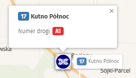 Etykiety punktów na mapie, które wskazują lokalizacje węzłów drogowych, zawierają numer węzła, o ile taki jest nadany, oraz jego nazwę.