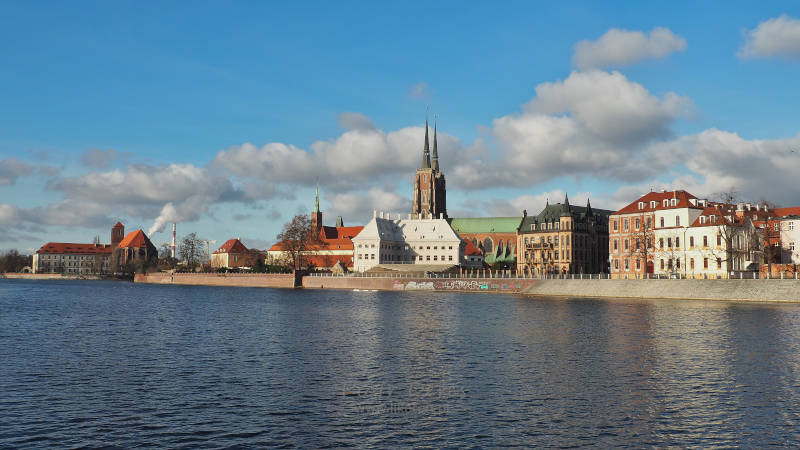 Mostem Piaskowym przeszliśmy na Wyspę Piasek, a na niej weszliśmy na trasę spacerową, która prowadzi Bulwarem Piotra Włostowica. Tutaj poza widokiem na Odrę, która okala wyspę, jest świetny widok na Ostrów Tumski, a na nim na kościół św. Krzyża i św. Bartłomieja, czy kościół Jana Chrzciciela w oddali.