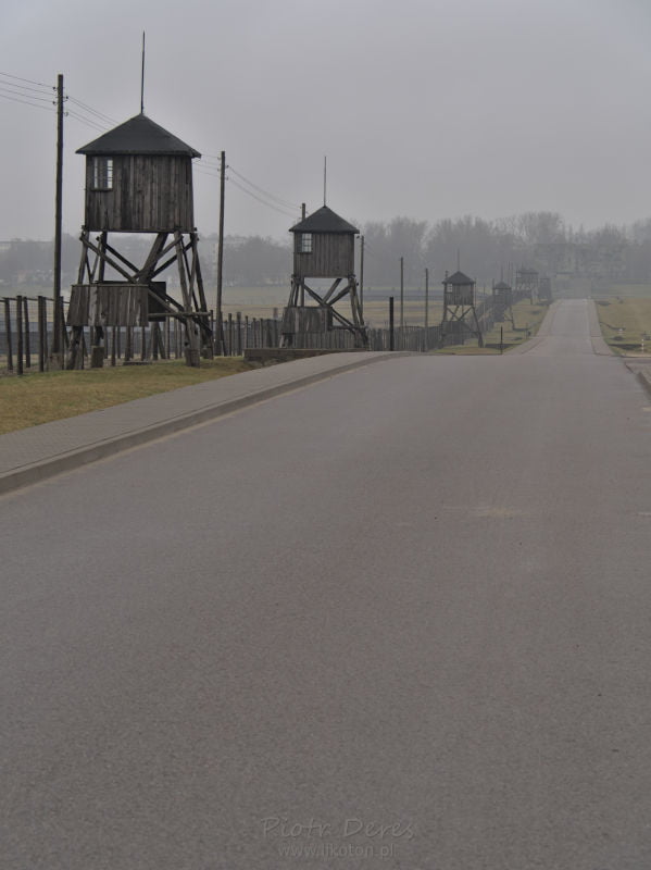 Gdy obeszliśmy Mauzoleum i krematorium, mijając wieżę wartowniczą, wróciliśmy do samochodu. Tym razem podjechaliśmy na kolejny parking, znajdujący się przy wejściu do obozu więźniarskiego. Zanim jednak nam dojechaliśmy, zatrzymaliśmy się zobaczyć Pole więźniarskie III, gdzie znajdują się liczne baraki, umywalnia, czy Kolumna Trzech Orłów, która powstała jeszcze za czasów funkcjonowania obozu, w 1943 r. Kolumna Trzech Orłów jest pierwszym pomnikiem ku czci ofiar Majdanka. Składa się cokołu z trzema stopniami, na którym stoi kolumna wykonana z rury kanalizacyjnej, wypełnionej prochami więźniów. Na szczycie kolumny znajduje się urna opleciona wieńcem laurowym, na której umieszczone są trzy pół-gołębie pół-orły wzbijające się do lotu.
