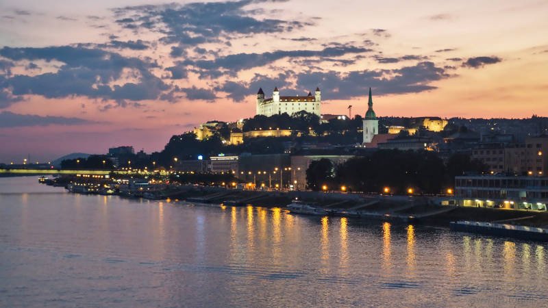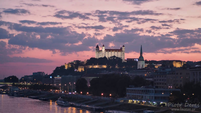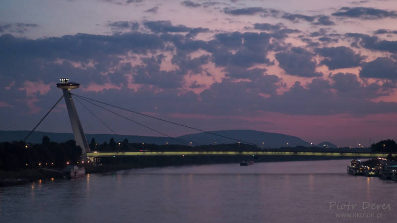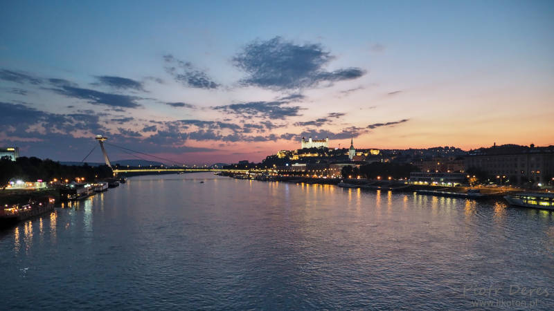 Spod kościoła ulicą Bezručvą, mijając ulicę Sienkiewiczovą, doszliśmy do Dostojevského. Przeszliśmy na drugą stronę ulicy i deptakiem doszliśmy do Starego Mostu. Stąd mieliśmy kapitalny widok na Stare Miasto z górującym nad nim zamkiem, Dunaj, bulwary, czy most SNP z restauracją UFO. Całość podkreślało oświetlenie.