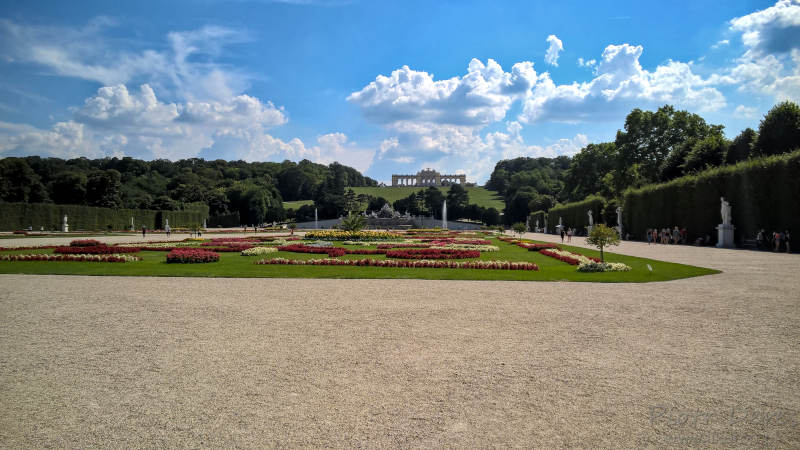 W kilka minut po wyjściu z samochodu byliśmy już przy bocznej bramie do parku. Niestety niesamowity upał spowodował, że odechciało się nam chodzić po ogrodzie. Tam, gdzie mogliśmy, chowaliśmy się pod drzewami. Odwiedziliśmy dużą część parku, ale nie byliśmy w zamku, gdzie były spore kolejki. Nie zobaczyliśmy ogrodu zoologicznego i kilku innych miejsc. Może zrobimy to innym razem, gdy na dłużej przyjedziemy do Wiednia.