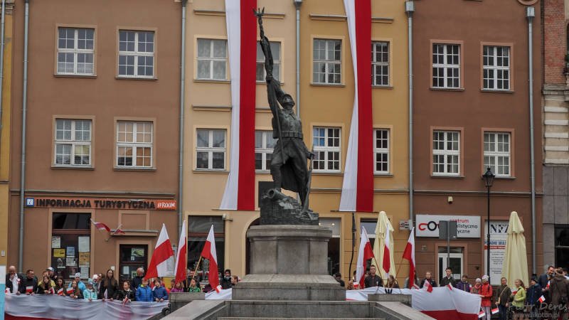 Na Rynku czekała na nas ciekawa atrakcja. Otóż obchodzony był Dzień Flagi Rzeczypospolitej Polskiej. Na miejscu oprócz władz miejskich byli żołnierze. Chętni trzymali flagę Polski w formie wstęgi, tworząc spory owal, otaczający pomnik Żołnierza Polskiego. Wyglądało to majestatycznie.