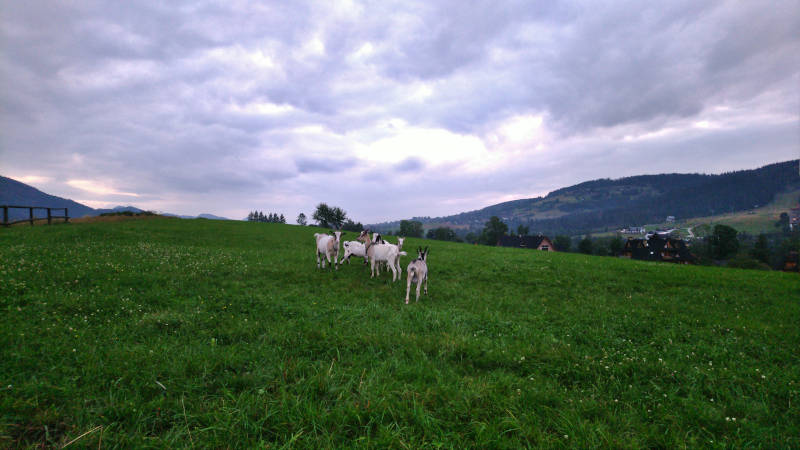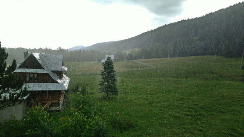 W Zakopanem zatrzymaliśmy się tam, gdzie podczas naszych poprzednich podróży. Nie zmieniamy naszego ulubionego miejsca u państwa Biegańskich w zakopiańskiej Mraźnicy. Bardzo lubimy tu wracać. Do tej ciszy, śpiewu ptaków i owieczek. Nie wiem tylko dlaczego, przywozimy ze sobą deszcz.