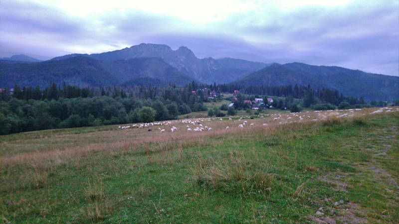 Ze względu na to, że mojej żonie wrócił ból, albo środki przeciwbólowe zaserwowane w szpitalu przestały działać, to wieczorem po deszczu wybrałem się na spacer do apteki. Musiałem dojść na Krupówki do apteki, a to z Mraźnicy 3 km w jedną stronę. Mimo to spacer był przyjemny, w szczególności powrót, gdy podszedłem na polankę przy Drodze na Wierch popatrzeć na Giewont i wypasające się owieczki.