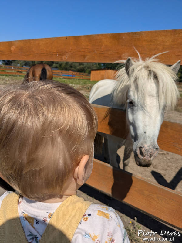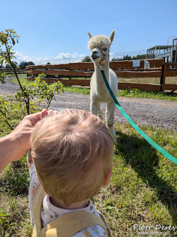Tu był mały klops, ponieważ jedna osoba musiała zająć się Jaśkiem, a druga do zaopiekowania miała dwie alpaki. Ciężko było zająć się i rozbieganym Jaśkiem i spokojną alpaką. W związku z tym ja z Jasiem spacerowaliśmy od zagrody do zagrody, aby popatrzeć na zwierzęta, a moją żonę prowadziły dwie alpaki. Od czasu do czasu trochę jej pomogliśmy, w tym nakarmić je marchewką.