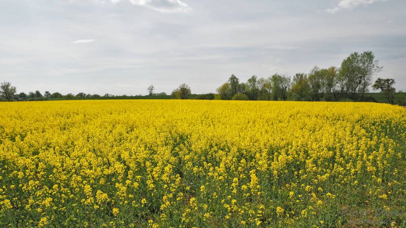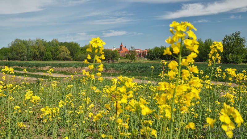 Zebraliśmy się i powoli ruszyliśmy w stronę mostu. Tym razem nie szliśmy od razu na wał przeciwpowodziowy. Ruszyliśmy polną drogą, przy której rósł rzepak. Kwitnący na żółto rzepak mogliśmy oglądać z bliska.